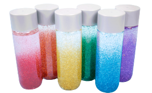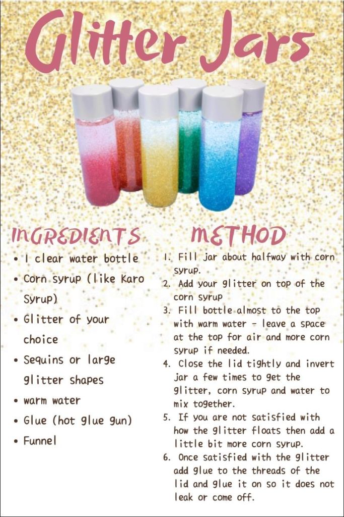 You can also use them as a sort of “time out timer” for little ones. They sit in their time out or rest area for the amount of time it takes for the glitter to fall and then hopefully feeling refreshed they can join the activity again. You can decide if it will be a fast or slow timer depending how much corn syrup you add.