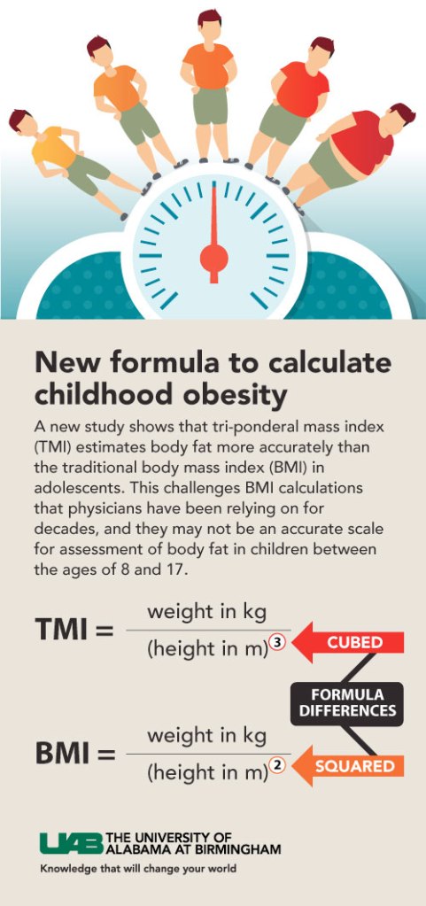 The University of Alabama reports that studies using the Tri-ponderal Mass Index (TMI) give a more accurate estimation of body fat percentage in children ages 8 years to 17 years. It is a similar formula to BMI but it cubes the height instead of squaring the height. More studies are needed to determine accuracy in varying ethnicities and age groups. University of Alabama Study Journal of Pediatrics article.