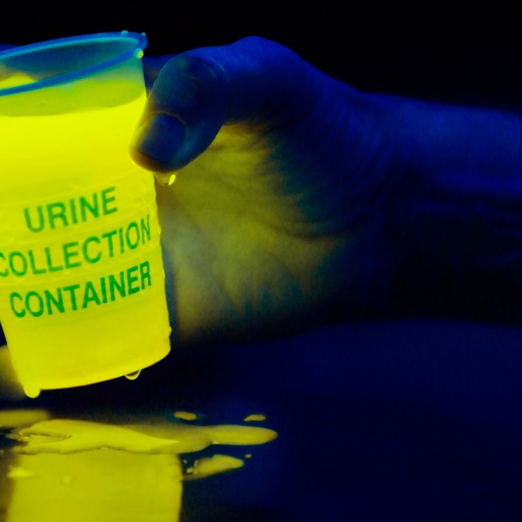 Urine: Glows yellow/green under the blacklight. Again, I would be unlikely to be determining urine stains vs other fluid stains in a school health room setting but the need for this knowledge could come up for some reason.