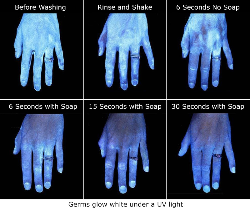 Germs: a blacklight or a Wood’s lamp can show poorly or unwashed hands! A great educational tool for students to show the importance of washing hands and how germs are spread.