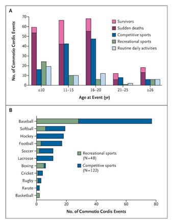 Commotio Cordis (CC) is most commonly associated with baseball/softball players as they run the risk of being hit directly in the chest with a fast moving ball. Additionally it is associated with hockey puck, lacrosse ball, soccer balls, cricket balls, and hockey sticks as they all have the likelihood of a fast moving direct hit to the chest. Also, any blow to the chest from a tackle, a punch (boxing, MMA fighting, martial arts), or even car accident can also cause CC.