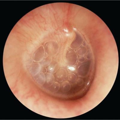 - Fluid in ear: this can be difficult to see at times but you might see a few bubbles behind the TM. Sometimes if there is a lot of fluid it can cause the TM to bulge out and you can see the line of fluid behind the TM. Fluid in the ear can be caused by allergies, a cold virus or an ear infection.