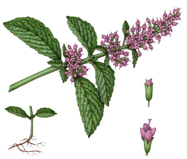 Peppermint (Mentha piperita), a popular flavoring for gum, toothpaste, and tea, is also used to soothe an upset stomach or to aid digestion. It has a calming and numbing effect, and is often used to treat headaches, skin irritation, nausea, diarrhea, menstrual cramps, flatulence, and anxiety associated with depression. It is also an ingredient in chest rubs used to treat symptoms of the common cold. In test tubes, peppermint kills some types of bacteria, fungi, and viruses, suggesting it may have antibacterial, antifungal, and antiviral properties. Menthol and methyl salicylate, the main ingredients in peppermint, have antispasmodic effects, with calming effects on the gastrointestinal tract. Several studies support the use of peppermint for indigestion and irritable bowel syndrome.